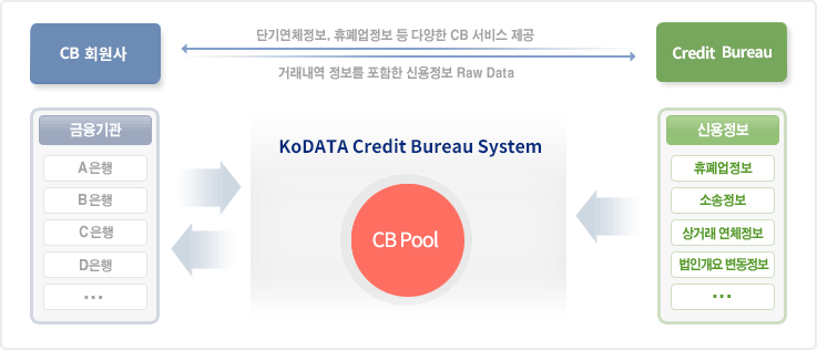 참여기관들로부터의 공유(Pooling)된 정보와 KoDATA에서 자체 수집(Collection)한 신용정보를 CB 시스템을 통해 가공(Analysis)하여 각 개별 기관에 제공하는 국내 최초의 기업 CB서비스입니다. |
